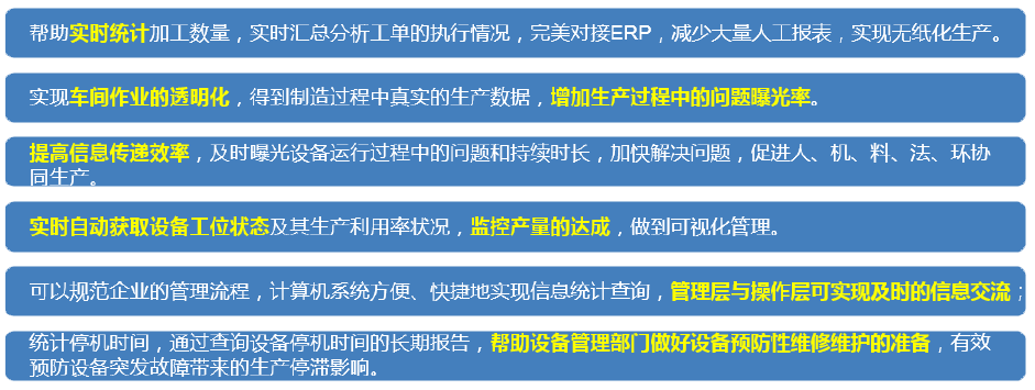 通过生产可视化管理系统,让管理者有效掌握企业信息,这样管理效果可以渗透到企业人力资源、供应链、客户管理等各个环节,使企业内部的信息实现可视化,并能得到更有效的传达,从而实现管理的透明化与可视化。